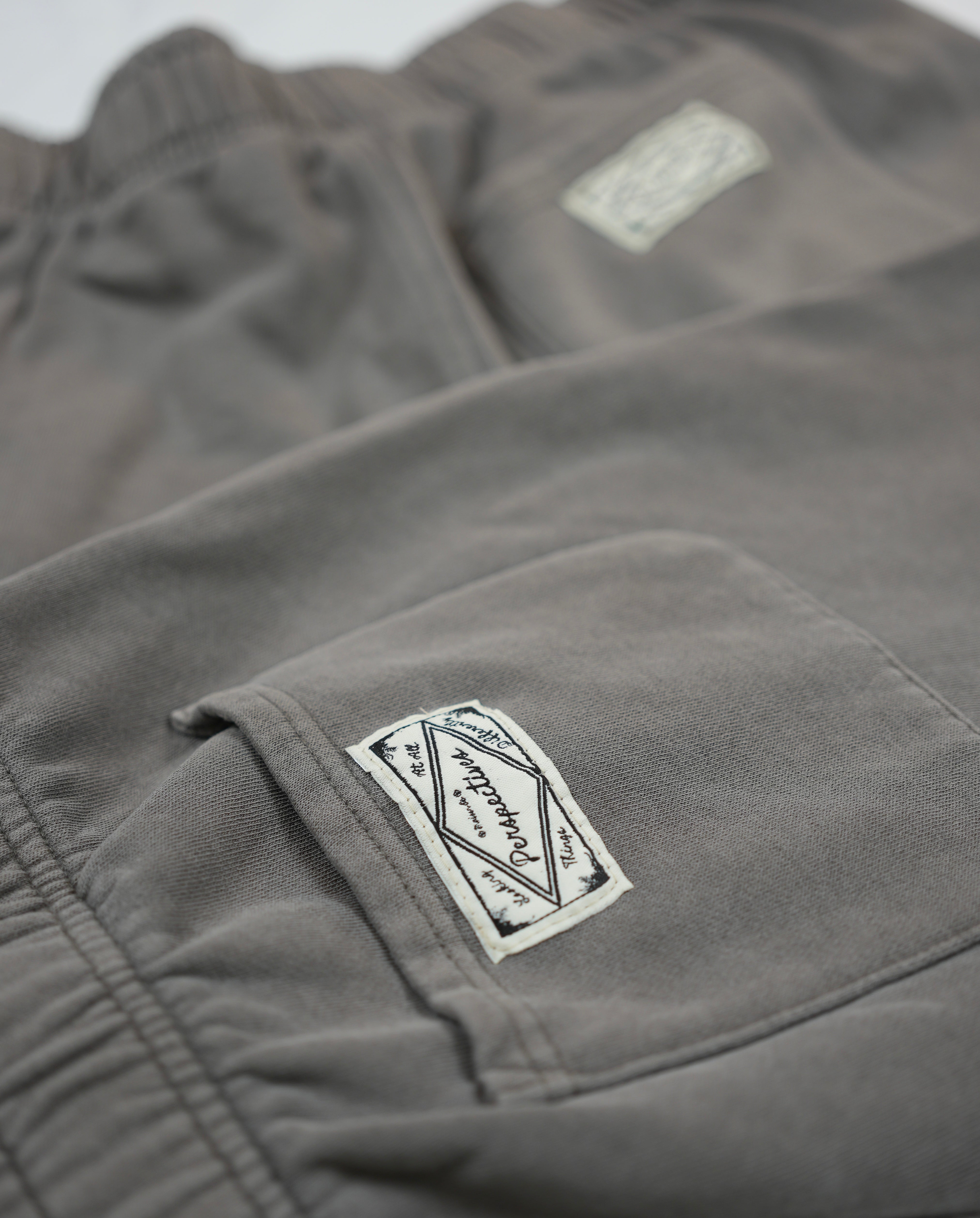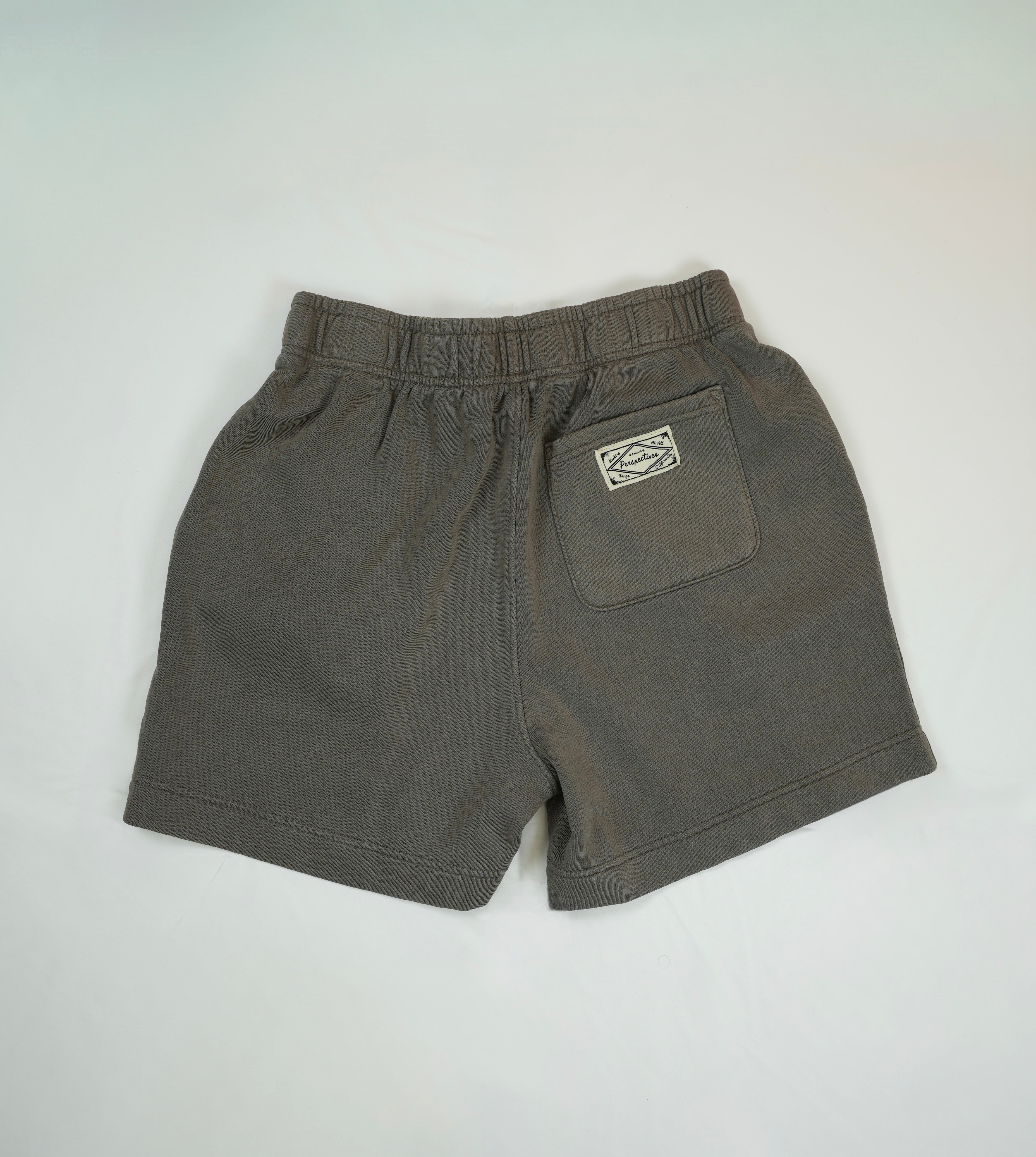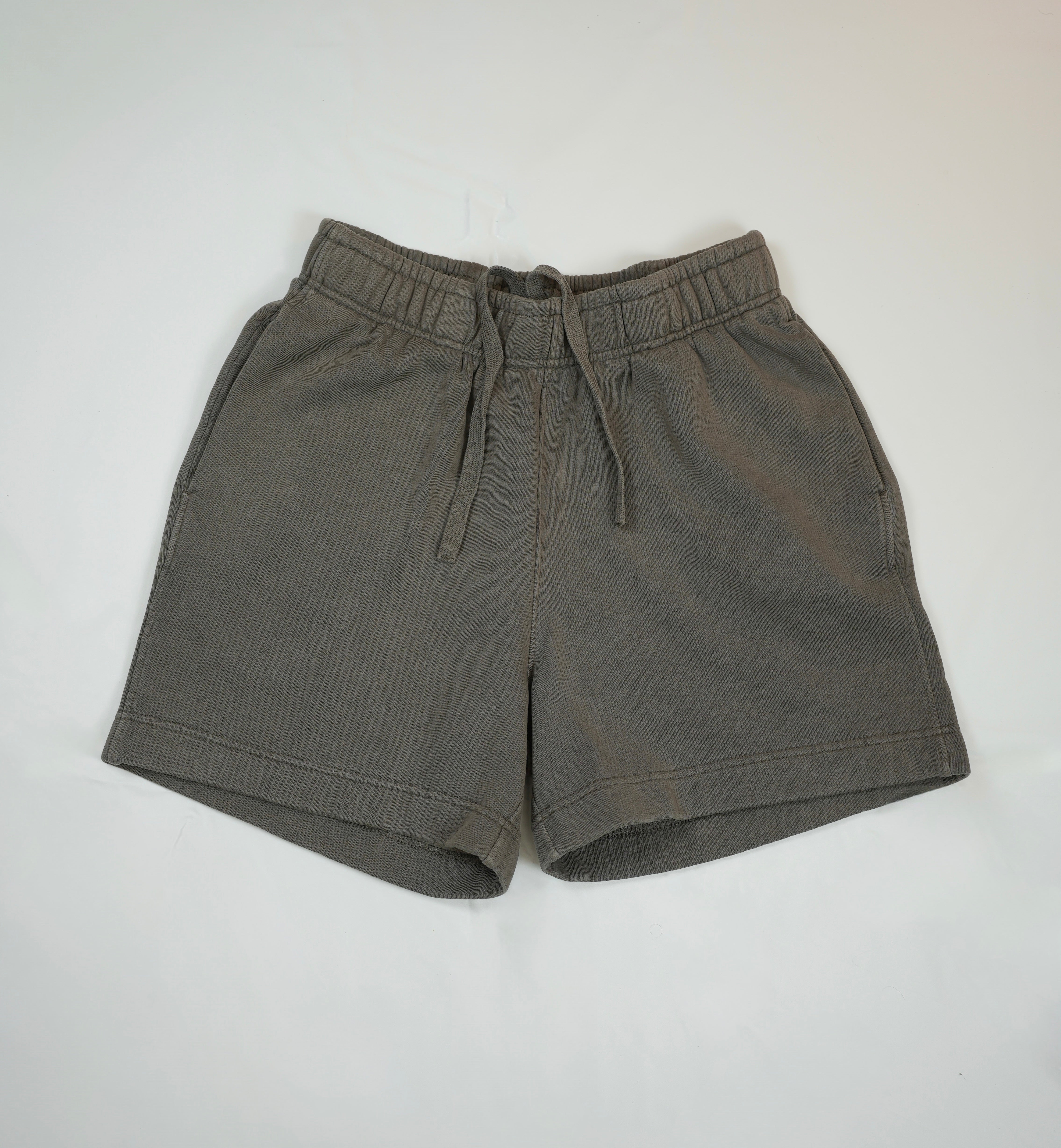 Sweat shorts, self-fabric elasticated waistband, tonal internal drawcord, garment dyed, 2 side pockets, single pocket at back, double needle hems
